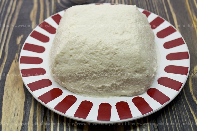 Сито поставьте на кастрюлю, а сверху установите груз. Это нужно, чтобы сыворотка с творога стекла.