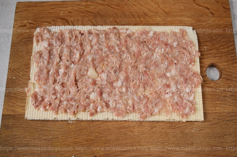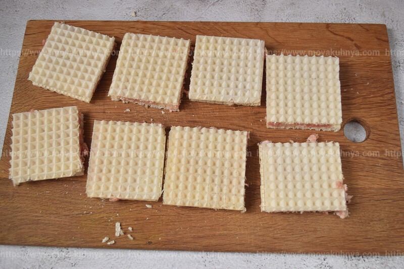 Вафли лучше брать прямоугольные. С ними работать гораздо удобнее, чем с круглыми. Разложите ровным слоем фарш на одну вафлю, накройте другой.