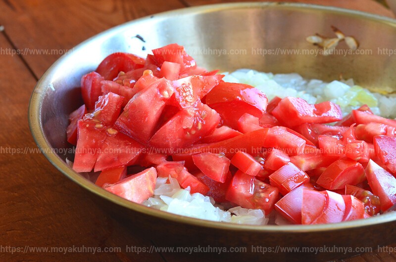 Очистите от шелухи лук и нарежьте мелкими кубиками. Выложите в разогретое растительное масло и начните жарить на огне чуть меньше среднего. Помидоры вымойте, обсушите и удалите плодоножку. Нарежьте небольшими кубиками и добавьте к луку.
