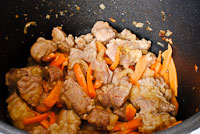 - Готовим морковь до полуготовности, добавляем горячую воду так, чтобы свинина с овощами были покрыты не полностью. Кладем соль и приправы по вкусу. Тушим на небольшом огне без крышки 30 минут.