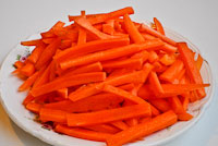 - Морковь очищаем, нарезаем соломкой. Кладем в небольшую кастрюльку, добавляем немного соли, заливаем горячей водой.