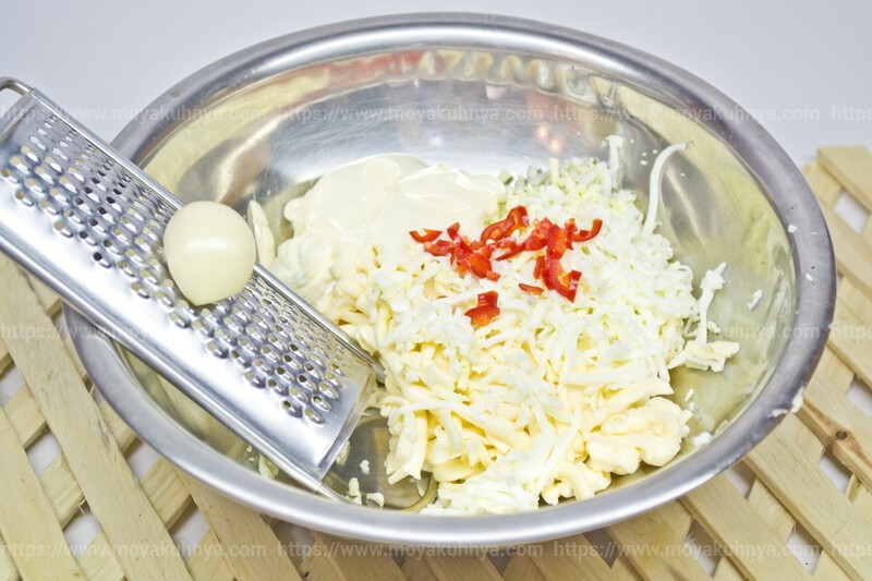 Яйца сварите вкрутую, очистите и мелко порубите. Добавьте плавленый сыр, майонез, выдавите чеснок через пресс и добавьте измельчённый перец чили, предварительно освобождённый от семян и плодоножки.