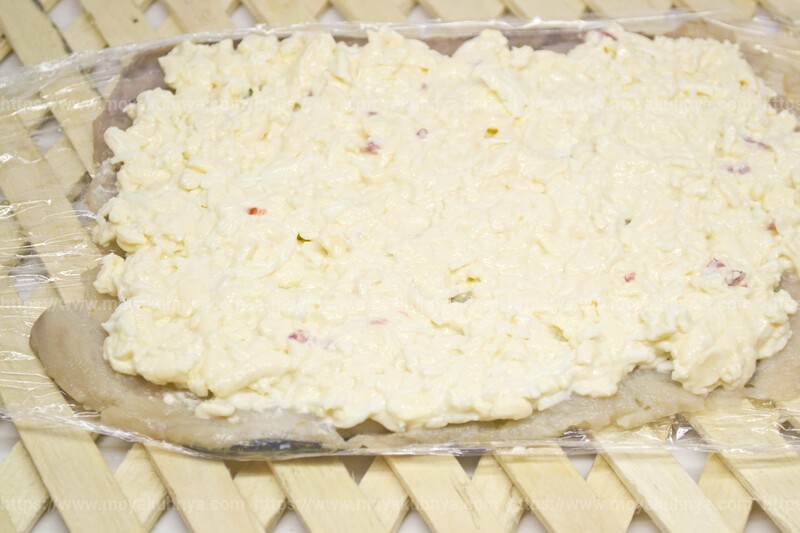 Положите целлофановый мешочек или застелите разделочную доску пищевой плёнкой. Выложите филе сельди и накройте второй плёнкой. Отбейте скалкой и раскатайте в прямоугольный пласт.