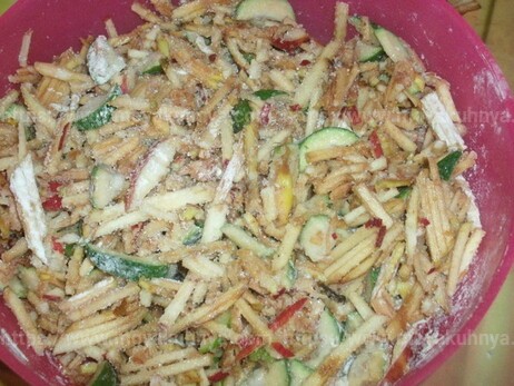 Для начинки мелко порезать яблоки и фейхоа, добавить крахмал и сахарный песок, перемешать.