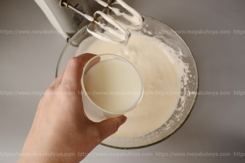 Влейте растительное масло и взбивайте на маленьких оборотах.