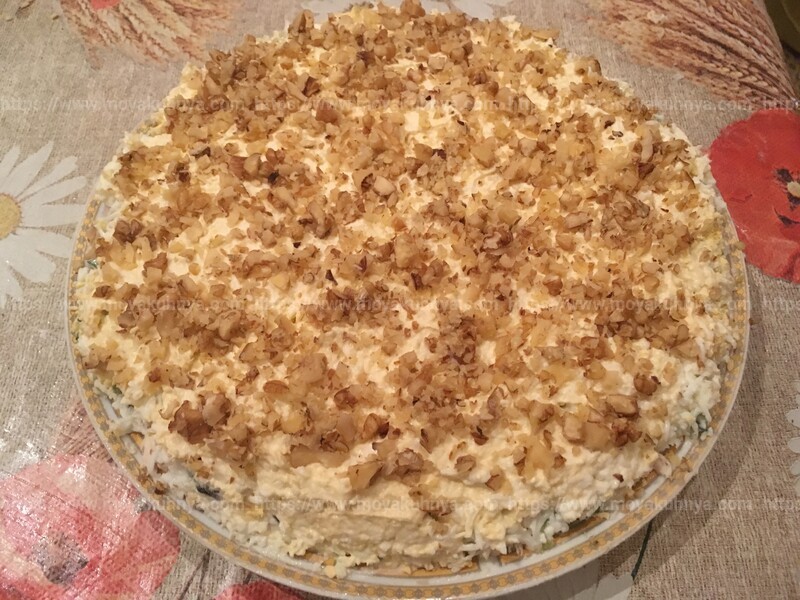 Украшаем салат мелко рубленными грецкими орехами. Не жалеем их, так вкус салата будет пикантнее. Готовому салату даем пропитаться в холодильнике 3-4 часа, я делаю с вечера. Приятного аппетита!