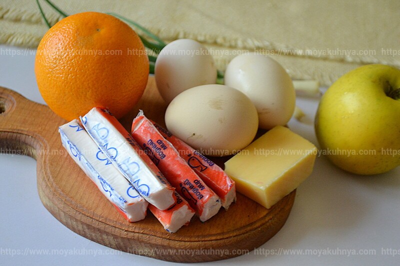 Подготовьте все ингредиенты, необходимые для приготовления фруктового салата с крабовыми палочками.