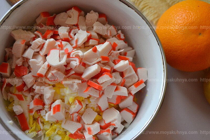 Крабовые палочки, если они замороженные, предварительно разморозьте в холодильнике. Лучше, конечно, покупать охлаждённые. Они более сочные. Нарежьте палочки кубиками.
