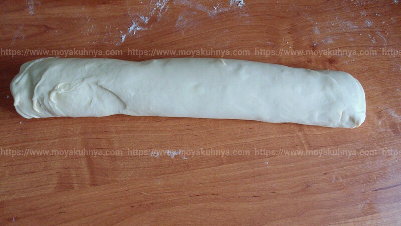 Каждый кусочек теста нужно раскатать так, чтобы середина была более толстой, чем края. Кусочки выкладывайте срезом вверх.